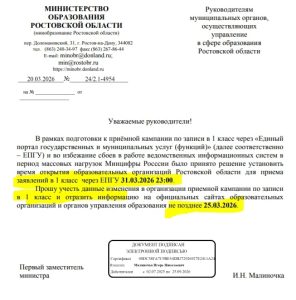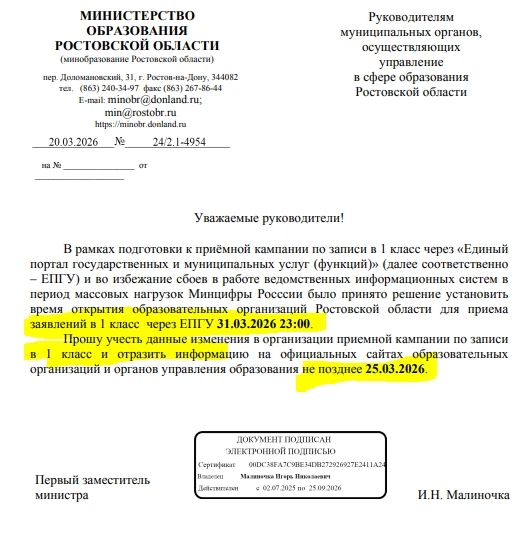В рамках подготовки к приёмной кампании по записи в 1 класс через «Единый портал государственных и муниципальных услуг (функций)» время открытия образовательных организаций Ростовской области для приема заявлений в 1 класс через ЕПГУ с 31.03.2026 23:00.